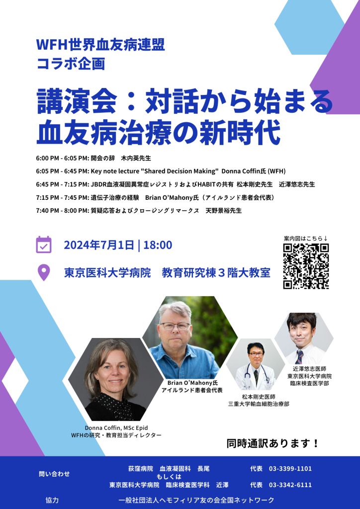 2024年7月1日(月)18時より、東京医科大学病院・教育研究棟3階大教室(東京都新宿区)にて、別イベントのために来日されるWFH(世界血友病連盟)の方々--Donna Coffin氏(研究・教育担当ディレクター)、Brian O’Mahony氏(元・会長)、他--をお迎えし、東京医大、荻窪病院とのコラボ企画(協力:ヘモフィリア友の会全国ネットワーク)講演会「対話から始まる血友病治療の新時代」が開催されます。