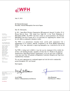 これを受けて、JB(日本血液製剤機構)を通じ、WFH(世界血友病連盟)より感謝の書状が届きました。