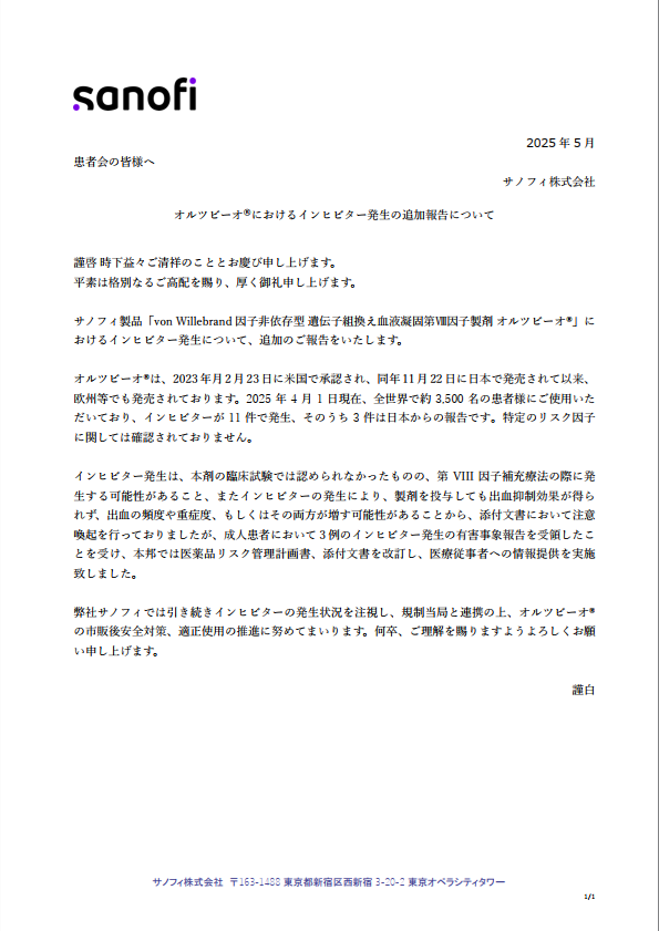 『オルツビーオ』におけるインヒビター発生事例に関して、5月8日にサノフィ株式会社より新たに患者会向け報告文書が届いたので、公開します。